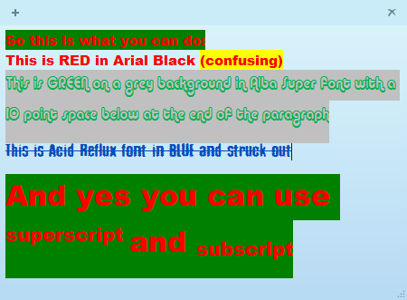 Windows 7 comes with Post-it® style Sticky Notes which can be stuck all over the desk top. Although you can change the background colour from a context menu and format the text from within the application, using Ctrl+Shift+[various keys] as per the Microsoft Instructions, the text style and colour can’t be changed from within. However you can change many things by cutting the text from the note and pasting it into Microsoft Word, if you have it, or WorPad if you don’t. (Use whichever starts quickest for you.) Most people are familiar with Notepad but not all are familiar with WordPad which is a cut down version of Word and is included with Windows. WordPad resides on the Start menu in the Accessories folder. Here is an example of what can be achieved:
