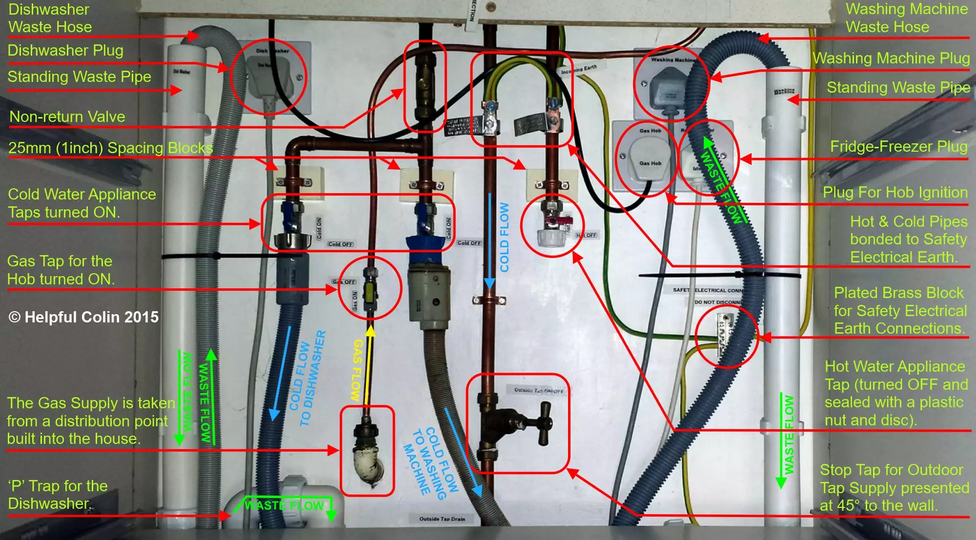 The waste water drain pipe for the dishwasher is on the left mounted vertically on the wall with the open top as high as possible. Similarly the waste water drain pipe for the washing machine is on the right. The appliance drain hoses hook into them in the standard manor and are ‘zip tied’ (fixed with a cable tie) to them to keep them neat and tidy. The flexible appliance waste hoses are tough and don’t stay where they’re put if they are left loose.