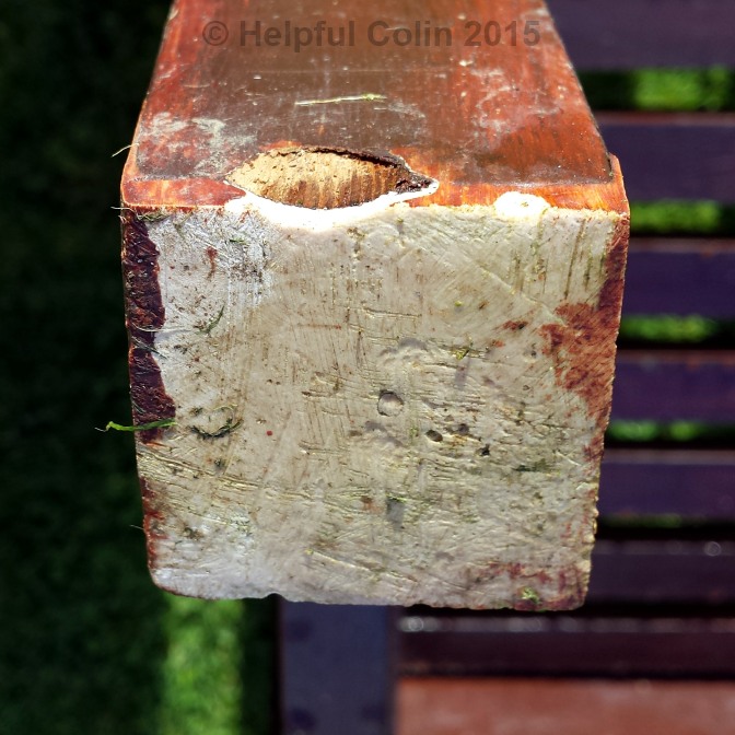 I have two teak garden seats which spend all their time outdoors on the lawn or patio. They go back to the 1980’s and the bottom of all the legs has rotted where they are perpetually in contact with the ground. I first noticed the problem while I had them upside down when I was cleaning and sanding them ready for repainting. I dug a penknife into the underside of the end of each leg only to find the wood was soft and easily dug out. I had painted them with exterior paint several times over the years but this wood wasn’t good to paint anymore.