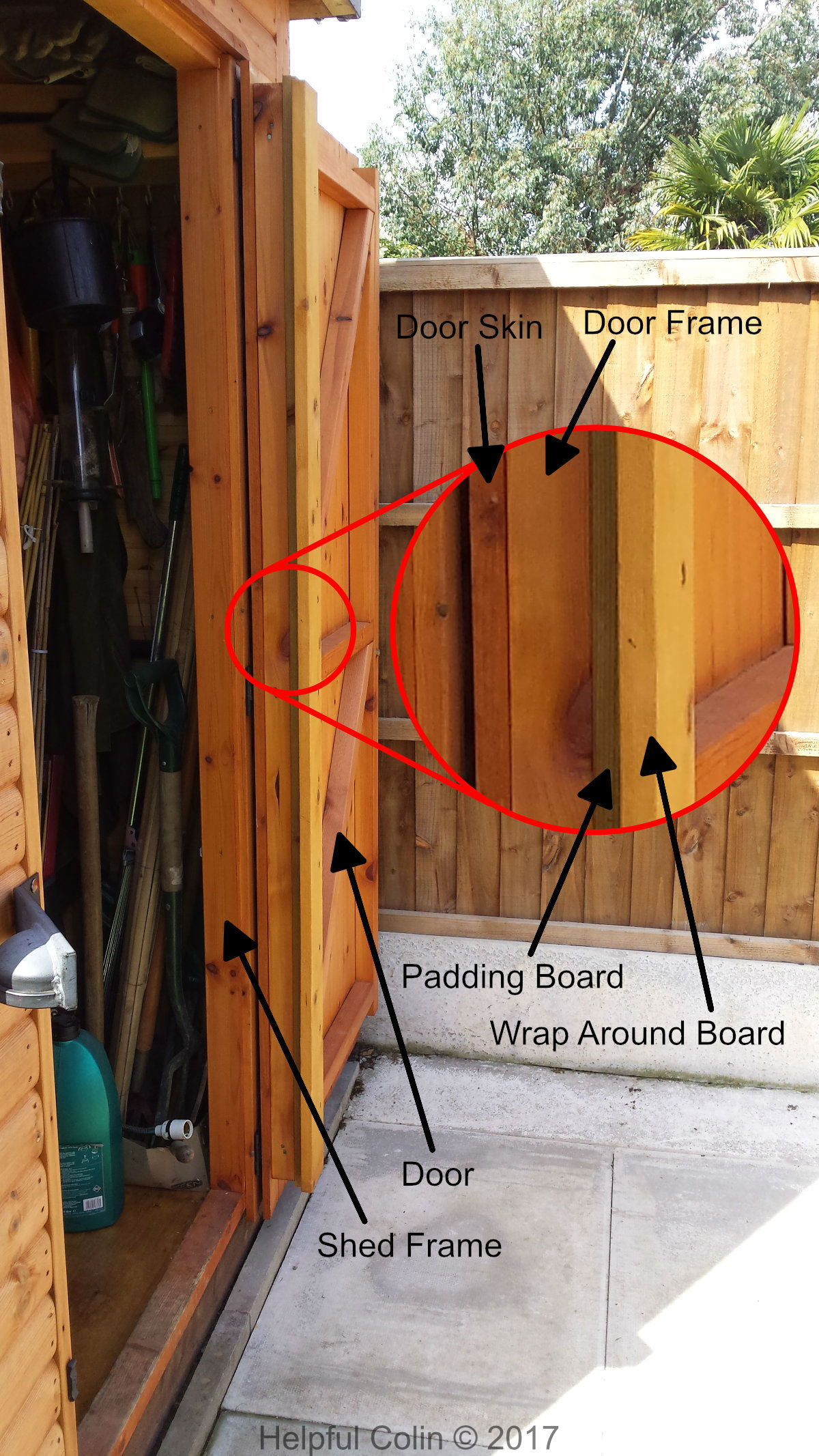 I Screwed and glued a similar length of 2cm “wrap around board” (182cm x 8cm x 2cm), to the padding board. It’s wider than the padding board so it protrudes beyond the frame of the door by 3.5cm. This wraps around the shed frame at the doorway when the door is closed.