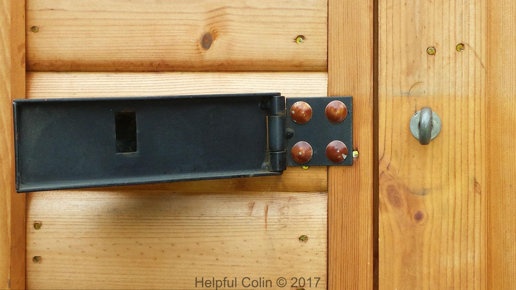 The picture above shows the Lullington hasp in the open position. The hasp is sold with a heavy-duty staple welded to a strong plate having four bolt holes. On my original shed the plate couldn’t be positioned satisfactorily so I used a galvanised eye bolt on the door.