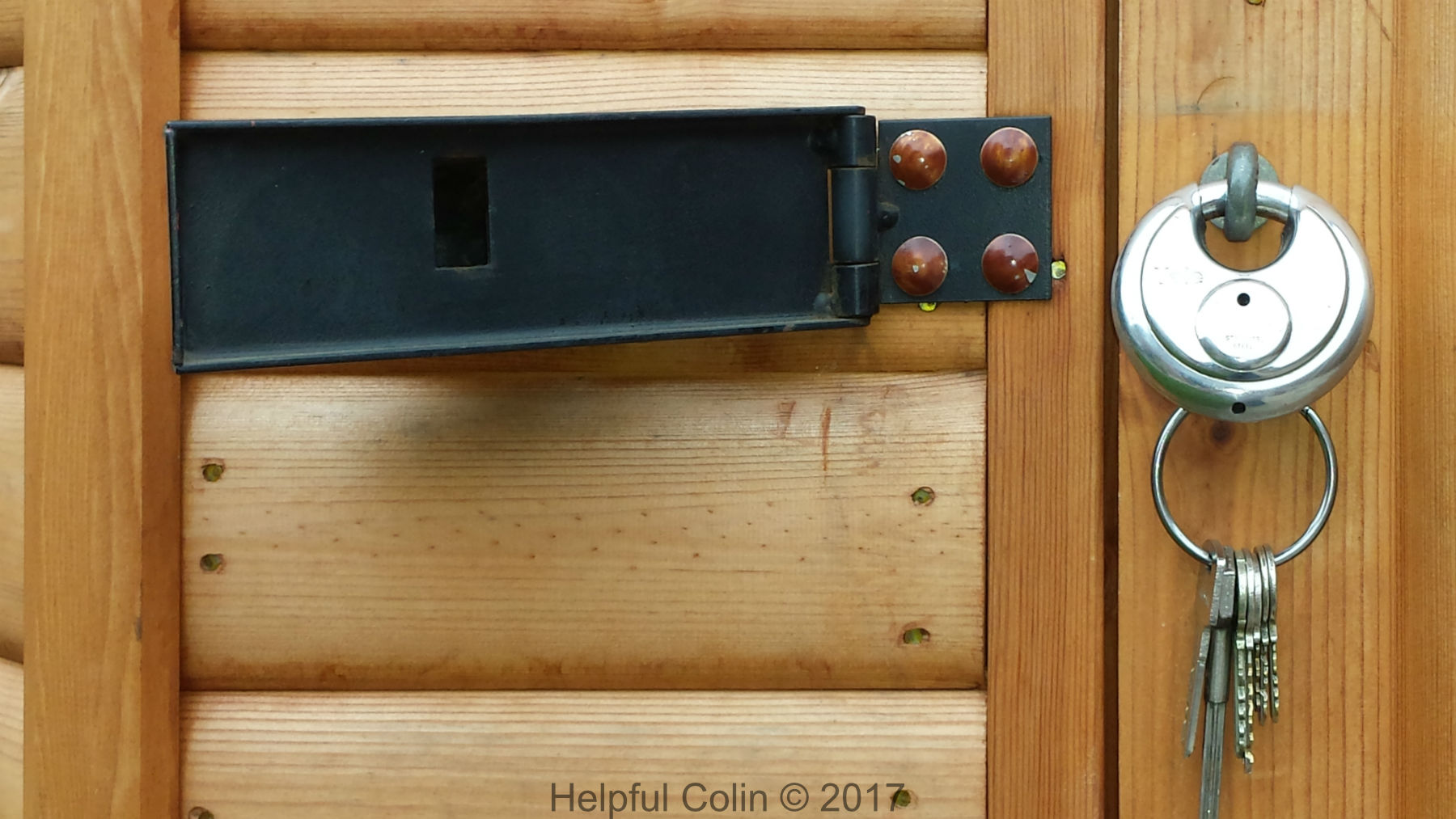 Both sheds were secured with two locks each, one of which was a disc padlock under a shrouded Lullington hasp. The other locks were the originals. On one shed I had a mortise rim lock and on the other another hasp and staple with a traditional padlock.